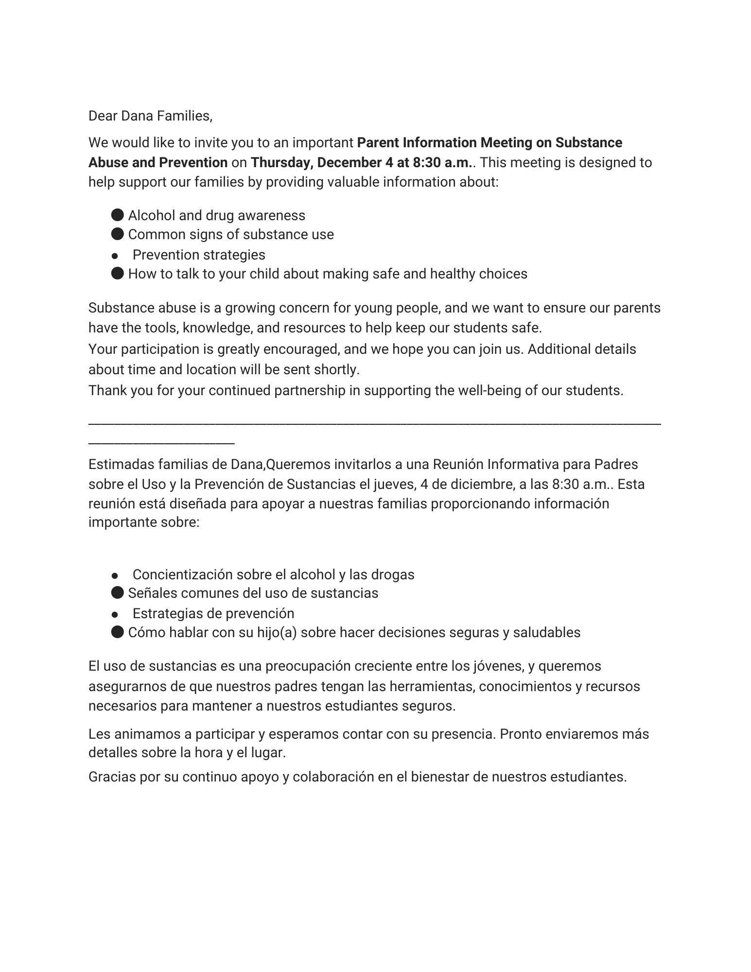 Thursday Dec. 4th Meeting Parents/Guardians 8:30am -9:30am